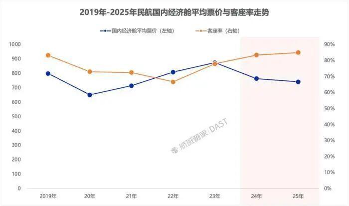 航班管家的数据分析显示,2023年国内旅客运输量已超2019年水平,客座率也不断走高,这背后是航空公司普遍采取的“以价换量”策略,2024年经济舱平均票价同比下滑12.7%,2025年依旧延续低票价策略,全年经济舱平均票价达738元,同比下滑3.1%,呈现“旺丁不旺财”的现象。